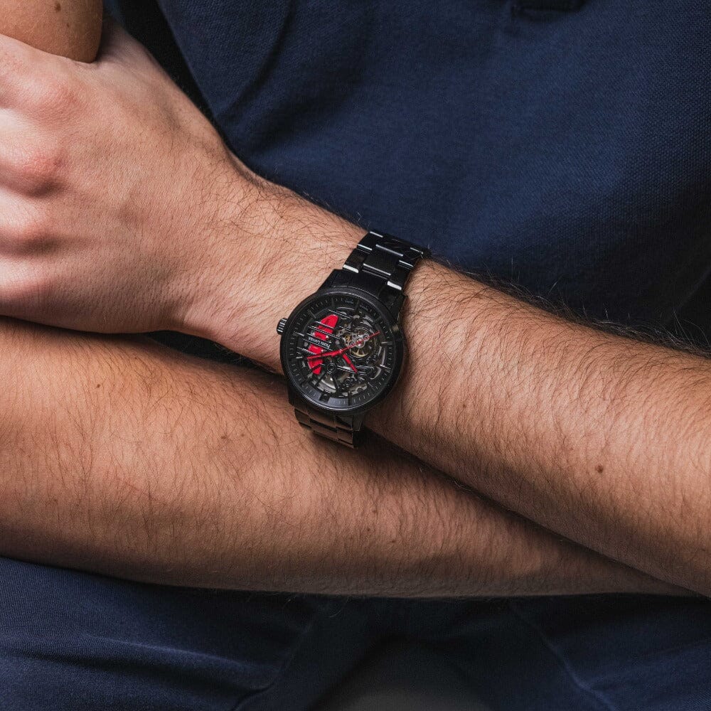 Son cadran squelette noir, accentué par un étrier de frein rouge et des aiguilles dynamiques, s’intègre dans un boîtier en acier noir et se prolonge par un bracelet bicolore mat et brillant.